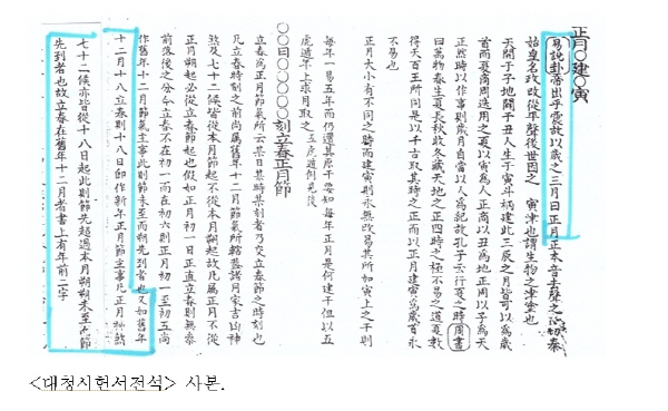 이런 등등의 사실은 현재 사용되고 있는 달력[시헌력법]을 상세히 설명한 <대청시헌서전석(大淸時憲書箋釋)>을 통해서 명확히 확인되었다. 이 책에서는 “세(歲)의 3월을 정월로 삼았다(歲之三月曰正月).”라고 했다. 이것은 1년을 약 365일로 삼은 세(歲)라는 달력 즉 24절기력의 자월(子月)과 축월(丑月)을 지난 3번째 달인 인월(寅月)을 음력 정월(正月)로 삼았다는 뜻이다.