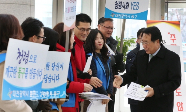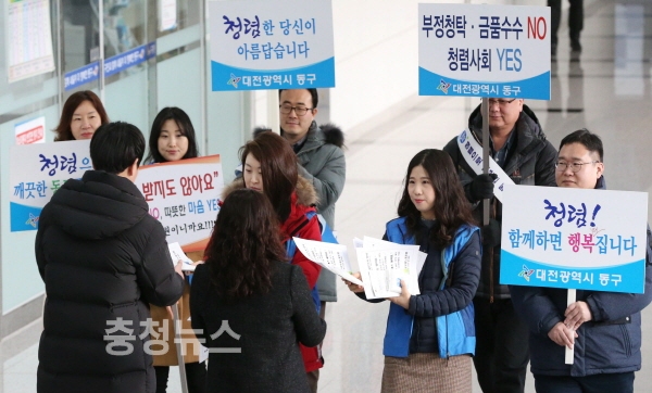 대전 동구(구청장 한현택)는 동구청 공무원노동조합과 감사담당 직원이 설 명절을 앞두고 신뢰받는 공직사회 확립을 위해 5일 구청 1층 로비에서 출근길 공직자를 대상으로 자체 청렴캠페인을 펼쳤다고 밝혔다.