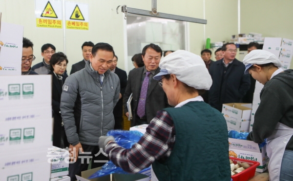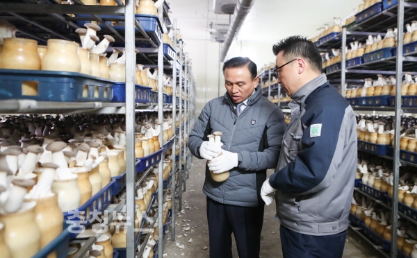구본영 천안시장이 입장면 신두리 소재 허니머쉬 영농조합법인을 방문해 현장을 둘러보고 애로사항 청취 모습