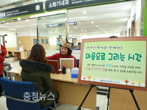 충남대학교병원 대전지역암센터(소장 김지연, 외과 교수)는 지난 8일 암센터 2층 로비에서 ‘TJB 화첩기행’을 진행하고 있는, 우리지역 동양화가‘박석신 작가와 함께하는 마음으로 그리는 시간’ 문화행사를 진행했다.