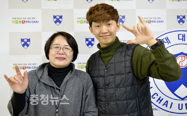 22일 배재대 레저스포츠학과를 졸업하는 이상현 씨(오른쪽)와 4년간 수화통역을 해온 박현옥 통역사가 ‘사랑해(I LOVE YOU)’를 표현하고 있다
