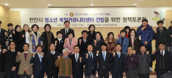 더불어민주당 박완주 의원(천안을)과 천안시의회 총무환경위원회 이종담 시의원(불당동, 쌍용1동, 쌍용3동)은 10일 오전 천안시 한들문화센터에서 ‘천안시 청소년 복합커뮤니티센터 건립을 위한 정책 토론회’를 공동 개최했다.