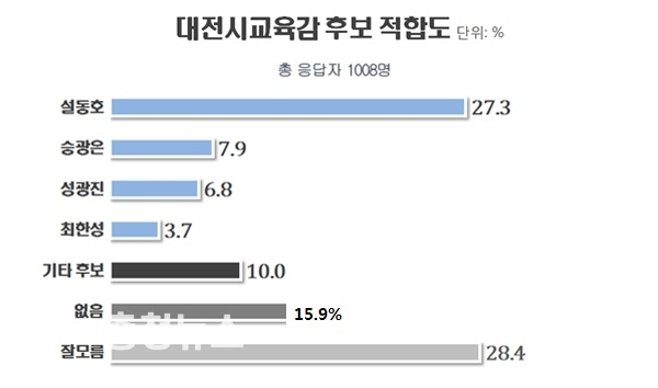 대전시교육감 후보 적합도 조사에서는 설동호 교육감이 27.3%로 선두를 달리고 있는 것으로 나타났다. 이와 함께 승광은 후보는 7.9%, 성광진 후보 6.8%, 최한성 후보 3.7%를 각각 기록했다. 이번 조사에서 기타 후보는 10.0%, 적합 후보 없음 15.9%, 잘 모름 28.4%로 집계됐다.