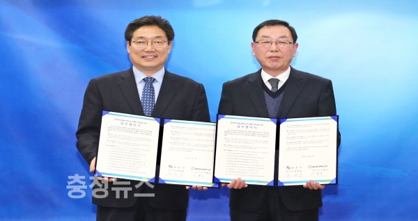 청년창업 활성화 및 중소벤처 육성 업무협약(사진 왼쪽부터 김홍장 시장, 이병우 센터장)