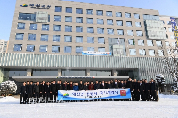 충남 예산군이 12일 새로운 청사에서 국기게양식·신청사 표지석 제막식을 개최하며 공식적인 업무 개시를 알렸다.