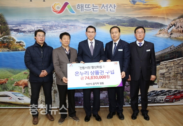 서산시가 온누리 상품권을 구매하기로 하고 이완섭 시장을 비롯해 관계부서 및 김경동 동부전통시장 상인회장과 기념촬영을 하고 있는 모습