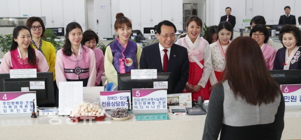 13일 구청 1층 종합민원실에서 한현택 구청장(가운데)과 한복차림의 직원들이 민원인을 맞이하고 있다