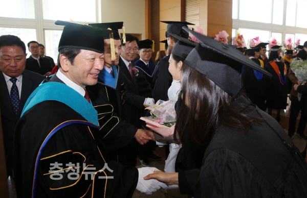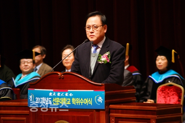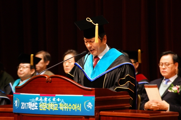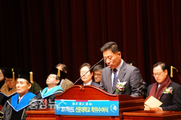 황선조 선문대 총장은 13일 2017학년도 전기 학위수여식에서 “우리대학에서 배운 섬김과 배려의 ‘인격자’, 소통과 나눔의 ‘세계시민’, 창의와 융합의 ‘전문인’의 3대 교육목표를 깊이 새기며, 세계를 무대로 꿈을 펼치는 주인공이 되길 바란다”고 졸업생을 격려했다.