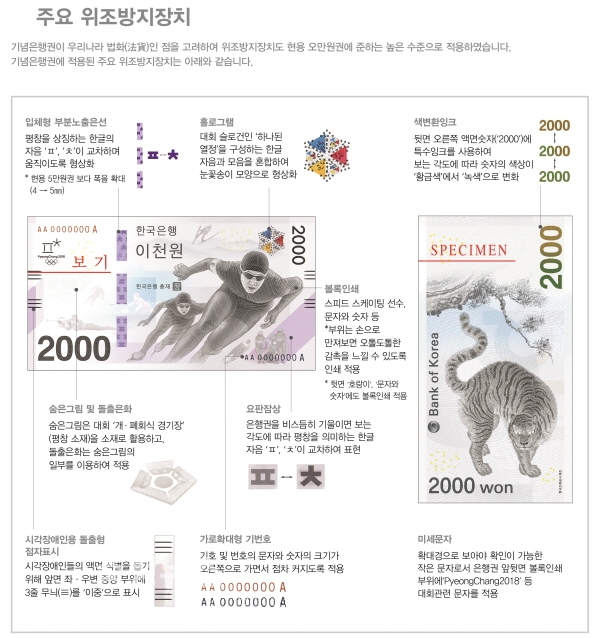 확대경으로 봐야 확인이 가능한 작은 문자로, 은행권 앞뒷면 볼록인쇄 부위에 ‘Pyeong Chang 2018’ 등 대회 관련 문자를 적용했다.