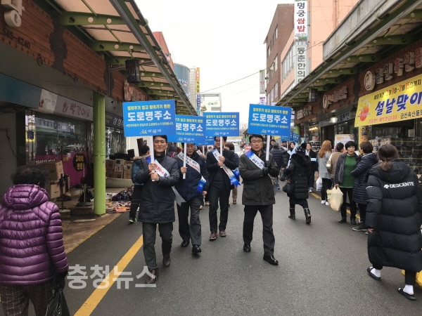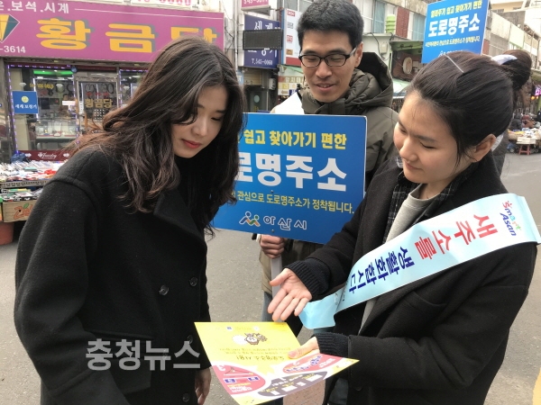 충남 아산시는 14일, 설 명절을 앞두고 온양전통시장 등 유동 인구가 많은 지역을 중심으로 토지관리과 직원 10여명이 참여해 ‘도로명주소 홍보 캠페인’을 실시했다.