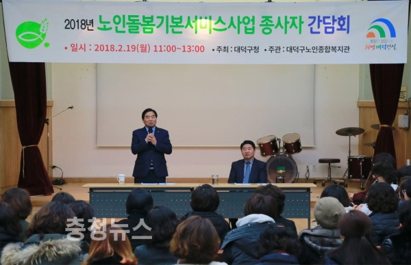19일 오전 대덕구노인종합복지관에서 열린 소통 간담회에서는 박수범 대덕구청장, 노인돌봄기본서비스 사업 종사자 등 70여 명이 참석한 가운데 매년 증가하는 노인 문제에 대한 심각성을 인식하고, 사업 발전 방안과 종사자 처우개선을 위한 심도 깊은 의견을 나눴다.