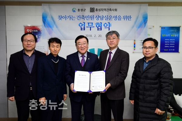 충남 홍성군과 홍성지역건축사회는 20일 군수실에서 홍성군수, 허가건축과장, 홍성지역건축사회장과 지역건축사회이사 등이 참여한 가운데 찾아가는 건축 민원 상담실 운영을 위한 상호협력을 위한 업무 협약을 체결했다.