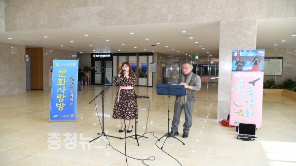 매주 수요일 신청사 1층 로비에는 군민과 함께하는 문화사랑방이 운영된다. 지난 21일 12시 20분부터 30분간 열린 문화사랑방에는 ‘함께하는 음악회’ 오카리나(정정자), 하모니카(길병권) 음악공연이 펼쳐져 직원 및 주민들은 차 한잔과 함께 공연을 감상했다.