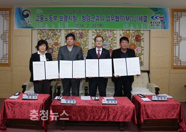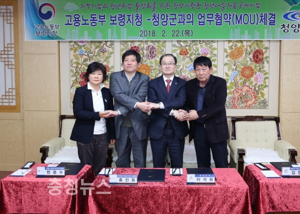 군은 22일 군청 회의실에서 이석화 군수를 비롯해 ▲고용노동부 보령지청 한흥수 지청장 ▲대전충남중소벤처기업청 홍진동 청장 ▲청양군기업인협의회 김영준 부회장과 ‘청양사랑형 청년내일채움공제’ 관련 업무협약을 체결했다.