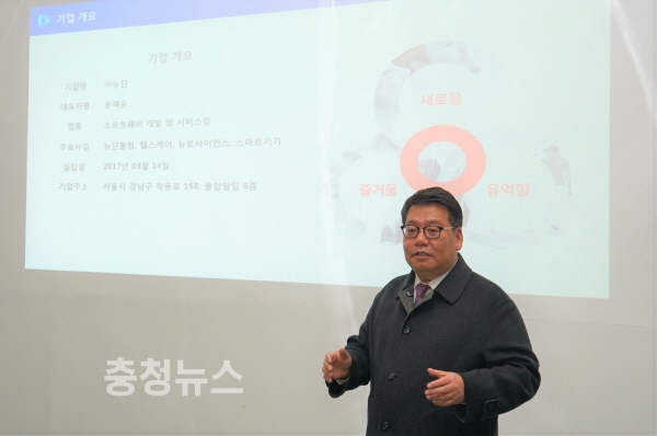 (주)뉴딘이 자체 개발한 스크린볼링 시스템인 '뉴딘VR볼링' 시연회에서 윤정훈 사업부장이 참석한 예비창업자들에게 국내 볼링 산업 현황과 '뉴딘VR볼링' 사업 전망에 대해 소개하고 있다