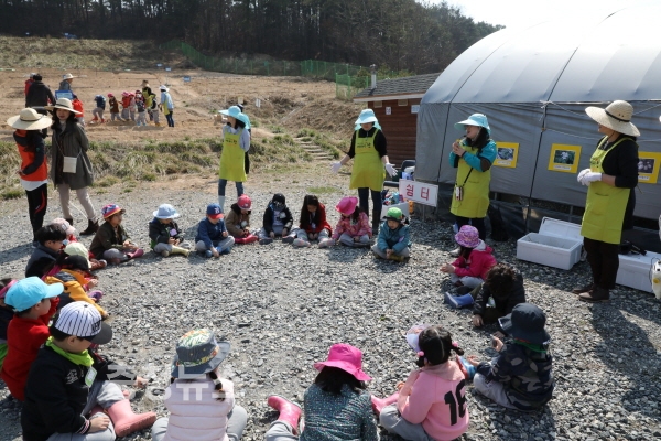 지난해 죽동 텃밭에서 진행된 어린이도시텃밭학교에서 유치원생들이 교육을 듣고 있다