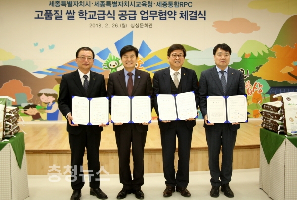 세종시, 세종시교육청과 세종시농협쌀조합은 싱싱문화관 1층 교육장에서 학교급식 식재료에 고품질 쌀(GAP 삼광)을 생산·공급하기 위한 업무협약을 체결했다.