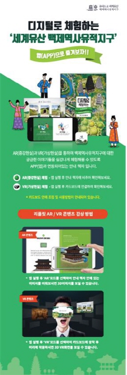 ‘디지털로 체험하는 세계유산 백제역사유적지구’는 AR(증강현실)과 VR(가상현실)을 활용하여 매장문화재가 대부분인 백제역사유적지구에 대한 궁금한 이야기를 실감나게 체험해 볼 수 있도록 구성됐다.
