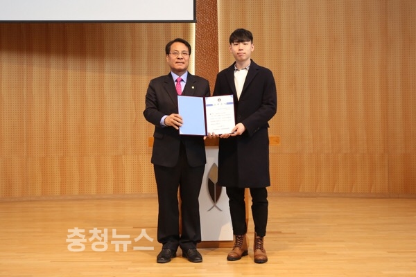 26일 ‘2018학년도 1학기 개강직원회의’와 함께 열린 직원장학금 수여식은 이덕훈 총장이 장학생 대표로 참석한 컴퓨터통신무인기술학과 4학년 박상우 학생에게 장학증서를 수여했다.