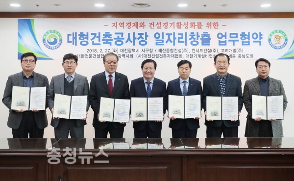 대전 서구(구청장 장종태)는 27일 구청 대회의실에서 지역경제와 건설 경기 활성화를 위해 ‘대형건축공사장 일자리 창출 업무협약’을 체결했다고 밝혔다.
