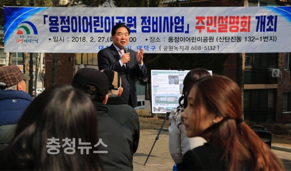 이날 주민설명회에 참석한 박수범 대덕구청장은 “이번 정비사업으로 안전하고 쾌적한 공원을 조성해 어린이들이 흥미롭게 놀 수 있고 이웃 간 공동체 의식을 함양할 수 있는 공간을 조성하는데 최선을 다하겠으며, 주민 여러분들의 많은 협조를 부탁드린다”고 당부했다.