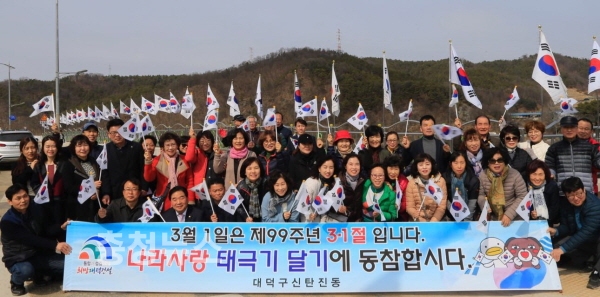 대전 대덕구 신탄진동(동장 강동구)이 제99주년 3․1절을 맞아 선열들의 나라사랑 정신을 기리고, 태극기의 소중함을 일깨우기 위해 동 자생단체 회원 100여명이 모여 대청대교를 태극기대교로 만들었다.