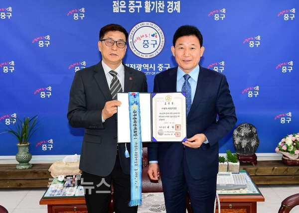 대전 중구(구청장 박용갑)은 27일 구청장실에서 2017년 국민추천포상 수상자로 선정된 사단법인 섬기는 사람들의 모임에 대한 표창장(훈격 국무총리)을 전수했다고 밝혔다.