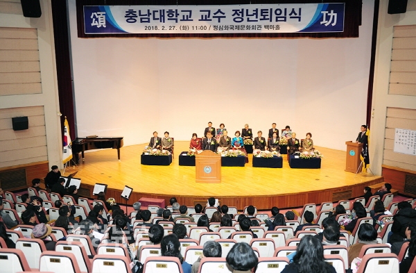 충남대는 27일 정심화국제문화회관 백마홀에서 김미연, 최수경, 조대우, 김건중, 원종호, 이만호, 이희익, 김재홍, 권광일, 김영신, 박순희, 김현수, 한상훈 교수에 대한 정년퇴임식을 개최했다.