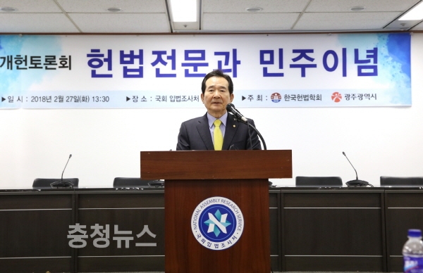 정세균 국회의장은 27일 오후 2시 국회 입법조사처 대회의실에서 열린 '헌법전문과 민주이념' 개헌토론회에 참석했다.