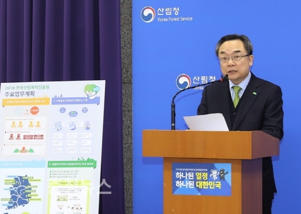 윤영균 산림청 한국산림복지진흥원장은 28일 대전 정부청사 통합 기자실에서 브리핑을 통해 “국민들과 함께 가꾸어 온 산림을 온 국민이 산림복지서비스를 통한 행복한 삶을 영위 할수 있도록 혼신을 다하겠다”고 강조했다.