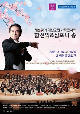충남 예산군은 이달 16일 오후 7시 30분부터 문예회관 공연장에서 군민과 함께하는 ‘함신익&심포니 송 새봄맞이 예산군민 가족콘서트’를 개최한다.
