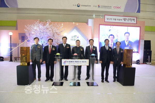 충남 공주시(시장 오시덕)가 2일 서울 코엑스에서 열린 내나라 여행 박람회장에서 인천 강화군과 함께 ‘2018 올해의 관광도시’로 선포했다고 밝혔다.