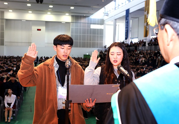 입학식에는 군사학과 박상민(21)‧천송희(20, 여)학생이 신입생 대표로 나서 입학식 선서를 했으며, 성적우수장학생으로 선정된 한의예과 권용문(20)학생이 장학증서를 전달받았다.