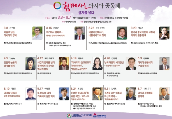 올해는 '경계를 넘다'라는 주제로 지역, 세대, 민족, 국가, 계층 등의 경계를 넘어 ‘평화’와 ‘상생’을 구현하기 위한 강좌로 마련됐으며, 매주 목요일 오후 3시 한남대 문과대학 인문홀에서 진행된다.