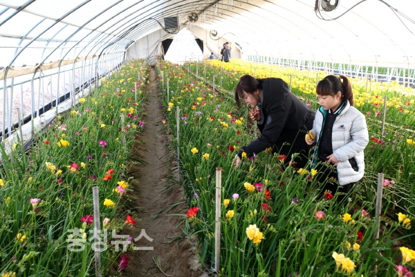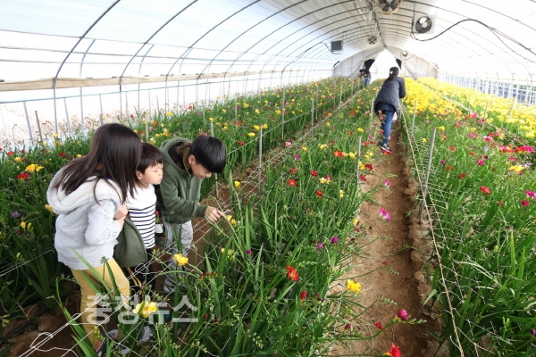 봄의 전령사 프리지어와 함께 봄 향기를 만끽할 수 있는 체험 프로그램을 당진 화훼농가들이 선보여 눈길을 끌고 있다.