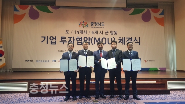 천안시는 5일 예산군 덕산면 리솜 스파캐슬에서 충청남도와 합동으로 풍세산업단지내의 ㈜EDL과 ㈜모트렉스, 목천읍 소사리의 ㈜연합정밀 등 3개 기업과 투자협약(MOU)을 체결했다.
