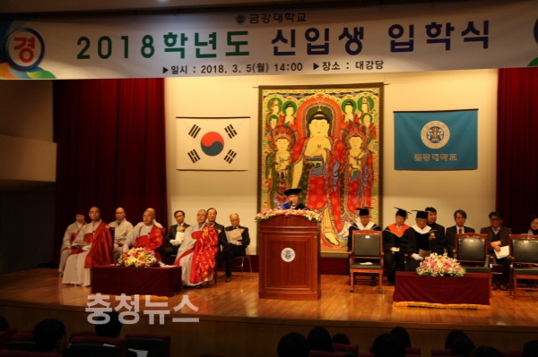 금강대학교가 5일 오후 교내 대강당에서 송희연 총장과 변춘광 학교법인 부이사장(대한불교 천태종 총무원장), 학교법인 사무처장 월장 스님, 교수 및 대학 관계자들과 학부모 등이 참석한 가운데 2018년도 입학식을 가졌다.