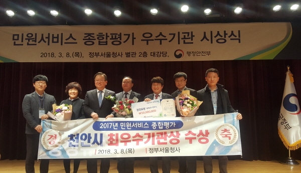 충남 천안시는 8일 행정안전부와 국민권익위원회가 전국 기관을 대상으로 실시한‘민원서비스 종합평가’에서 최우수기관으로 선정돼 행정안전부 장관표창을 수상했다.
