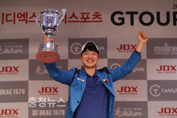 골프존이 개최한 ‘2018 JDX 멀티스포츠 GTOUR 정규투어 1차 대회’에서 최민욱이 우승컵을 들고 있다.