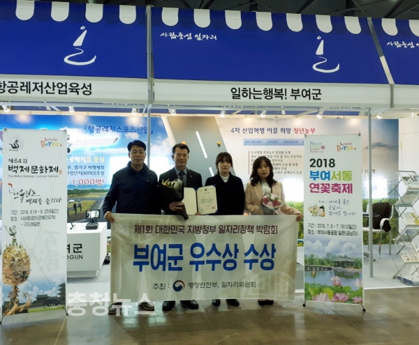 충남 부여군(군수 이용우)은 일산 킨텍스에서 지난 8일~11일까지 개최된 ‘제1회 대한민국 지방정부 일자리 정책박람회’에 ‘SKY 드림! 항공레저 산업 육성’, ‘4차 산업혁명 희망 청년농부 육성’을 주제로 참가해 우수상인 국토교통부 장관상을 수상했다.
