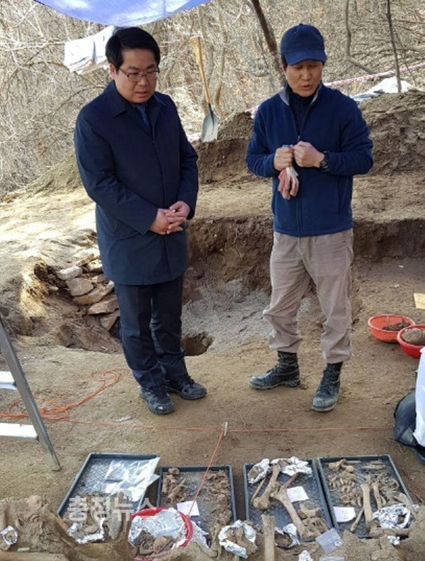 오세현 아산시장 예비후보가 12일 아산시 배방읍 중리 산86-1번지 일원에서 펼쳐진 ‘한국전쟁기 민간인 희생자 유해 발굴’ 현장을 찾아 차질 없는 발굴 작업을 당부했다.
