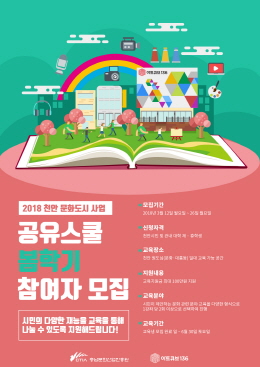 ‘2018 공유스쿨’은 천안 원도심이라고 불리는 명동거리(문화‧대흥동) 일대를 대상지로 하며, 봄(3월)‧여름(6월)‧가을(9월)학기로 3회 운영할 예정이며, 천안 시민 및 관내 대학 재‧휴학생이라면 누구나 참여할 수 있다.
