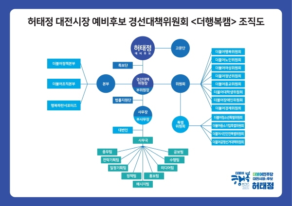 허태정 대전시장 예비후보는 이날 오후 고문단(11명), 경선대책위원장(2명), 더불어정책본부(29명), 더불어조직본부(106명), 행복파란서포터즈(11명), 더불어행복위원회 등 8개 위원회(100명), 더불어청소년특별위원회 등 4개 특별위원회(8명), 특보단(7명), 법률지원단(4명) 등 모두 303명의 ‘더행복캠’ 경선대책위 1차 명단을 공개했다.