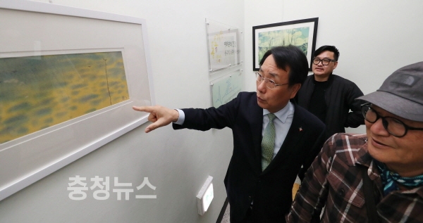 지역 작가 5인과 주민 등이 지난 대청호반 답사 주민원정대에서 대청호를 바라보며 표현한 서양‧동양화, 서예, 미디어 아트, 사진 등 총 32점의 작품이 전시된다.