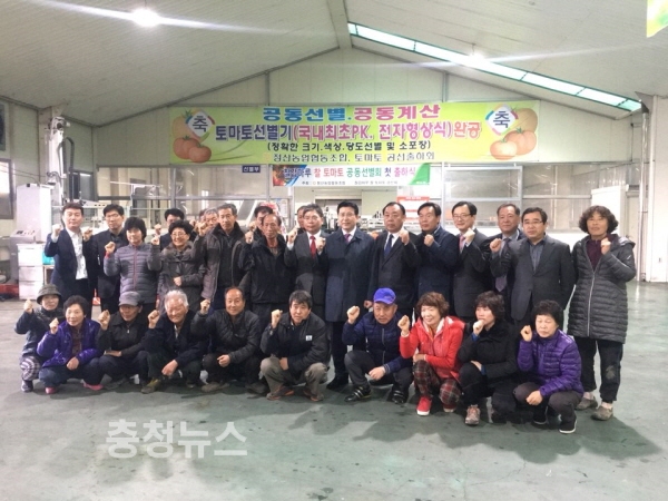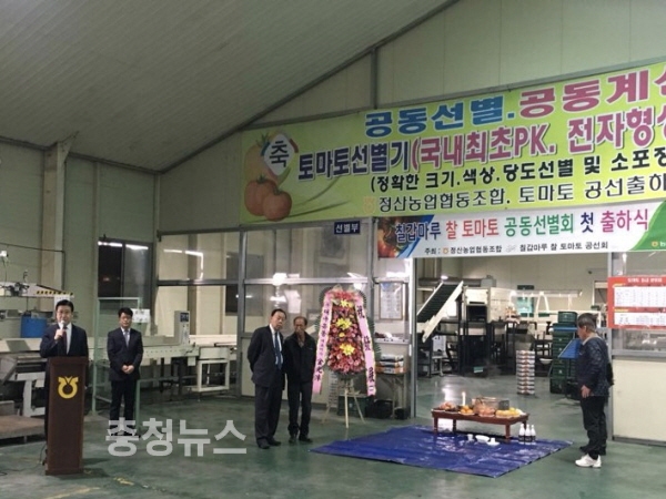 충남 청양군이 지원하고 정산농협에서 육성하고 있는 칠갑마루완숙토마토 공선회(회장 이기명)가 19일 정산농협 경제종합센터에서 강준배 부군수 및 김태영 정산농협조합장을 비롯해 회원 등 50여명이 참석한 가운데 올해 첫 출하식을 가졌다.