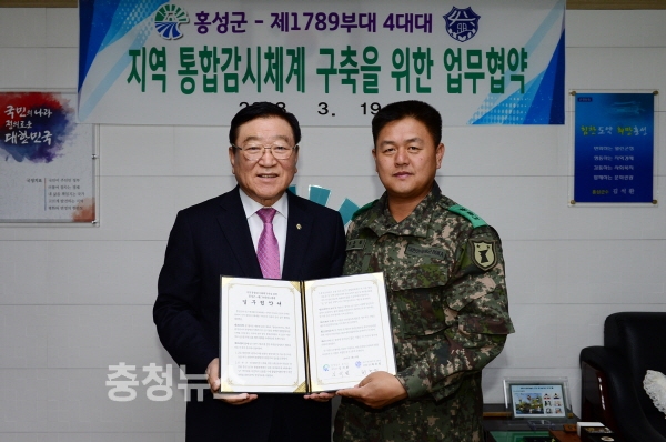 지난 19일, 홍성군과 육군 제1789부대 4대대가 지역 통합감시체계 구축을 위한 협약 체결을 가졌다.