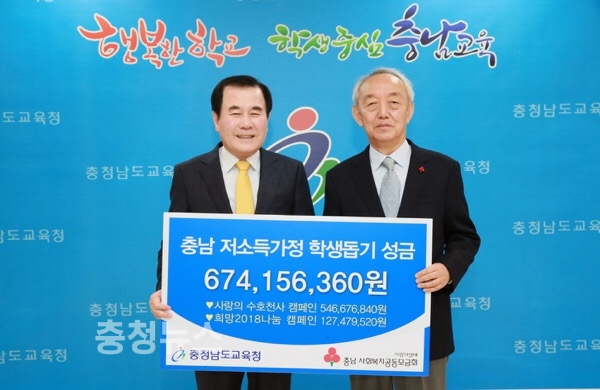 교육청은 사랑의 수호천사 모금액 5억 4600여만 원과 희망2018나눔 캠페인 모금액 1억 2700여만 원을 충남 사회복지공동모금회(회장 이관형)에 기탁했다.