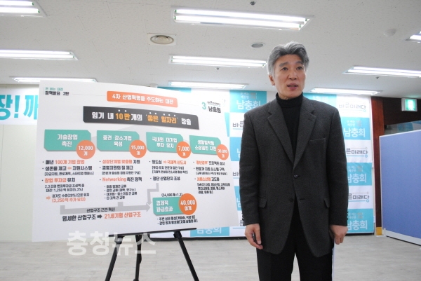 이날 정책발표에서 남 후보는 대전의 대학 졸업자들이 외지로 취업하는 현상을 지적하면서 "대전지역에 가고싶은 일자리를 만들어 인구유출을 막겠다"고 말했다.