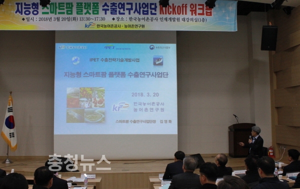한국농어촌공사(사장 최규성)는 20일 경기 안산 농어촌연구원에서 농림축산식품부, 공사 관계자 등 전문가 50명이 참석한 가운데‘지능형 스마트팜 플랫폼 수출연구사업단 Kick off 워크숍’을 개최했다.