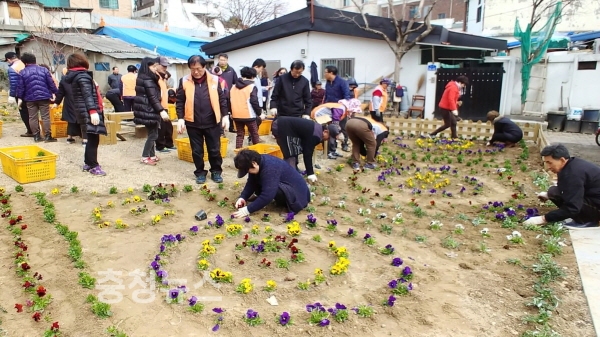 용두동(동장 이정노)은 22일 주민쉼터, 용머리공원, 마을 공터에 주민 50여명과 함께 펜지·가자니아·오스테오스펄멈 등 봄꽃 1600본과 영산홍 100그루를 식재해 화사한 봄꽃 내음이 물씬 풍기는 동네로 조성했다.